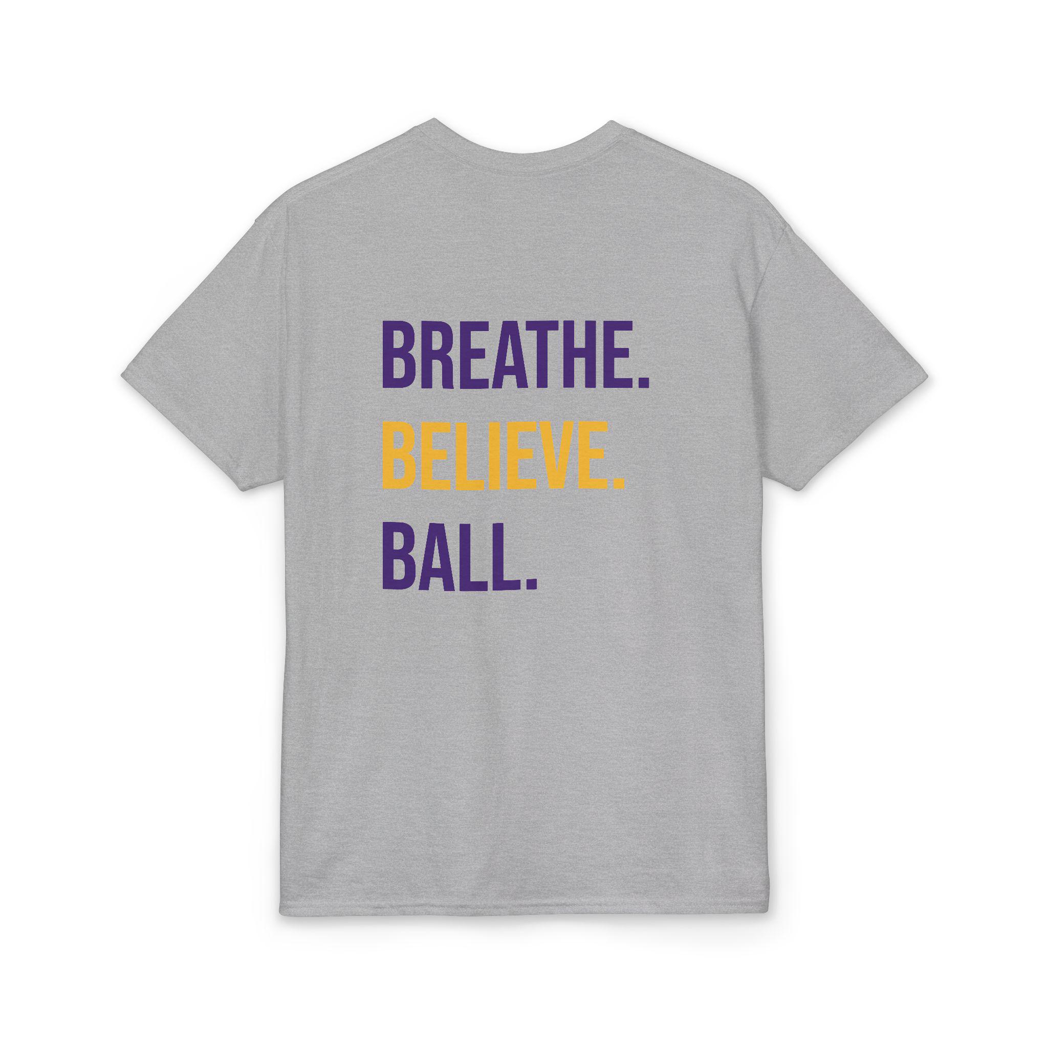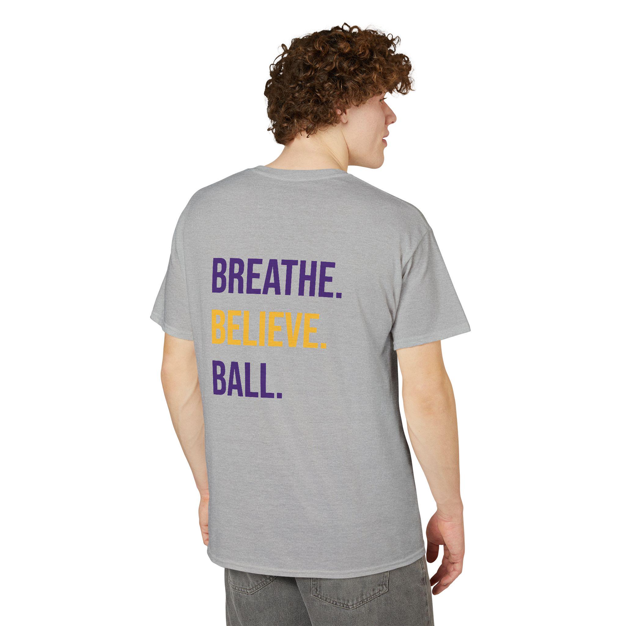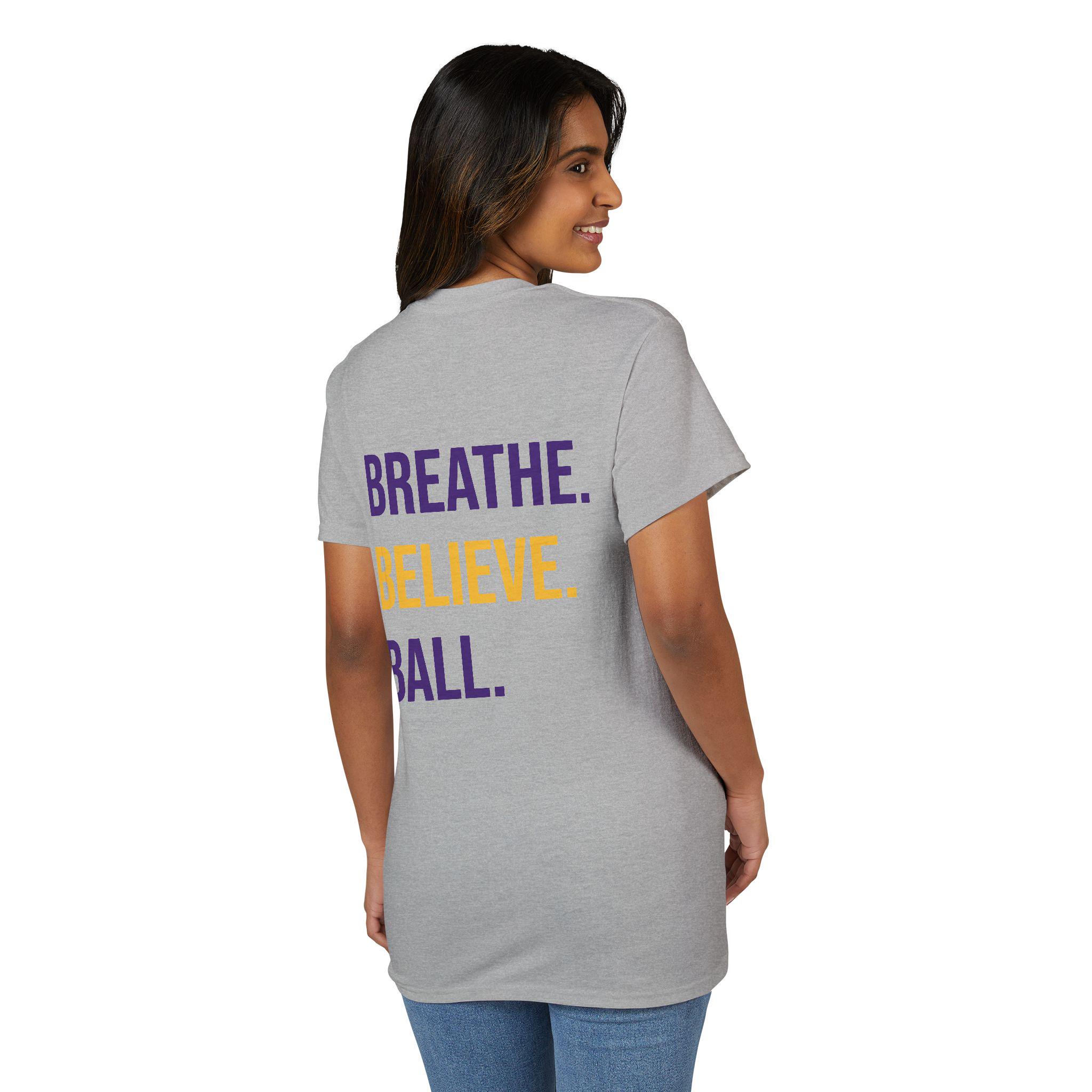 This easygoing tee is built for game-day calm. The front features a minimal “sports meditation” emblem: a centered, eyes-closed quarterback silhouette sitting cross-legged inside a clean circular badge, with a small football horizon line and subtle Norse-geometry accents. The palette is purple, gold, and white, quietly nodding to northern-football culture without team names or logos. On the back, a simple three-line mantra in contrasting type: BREATHE. BELIEVE. BALL.