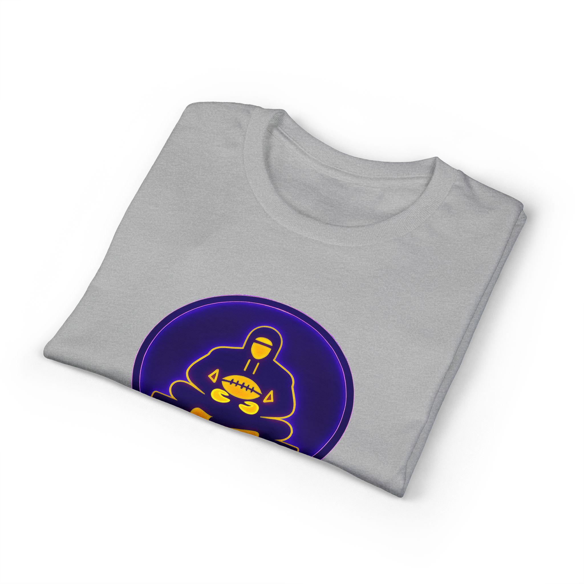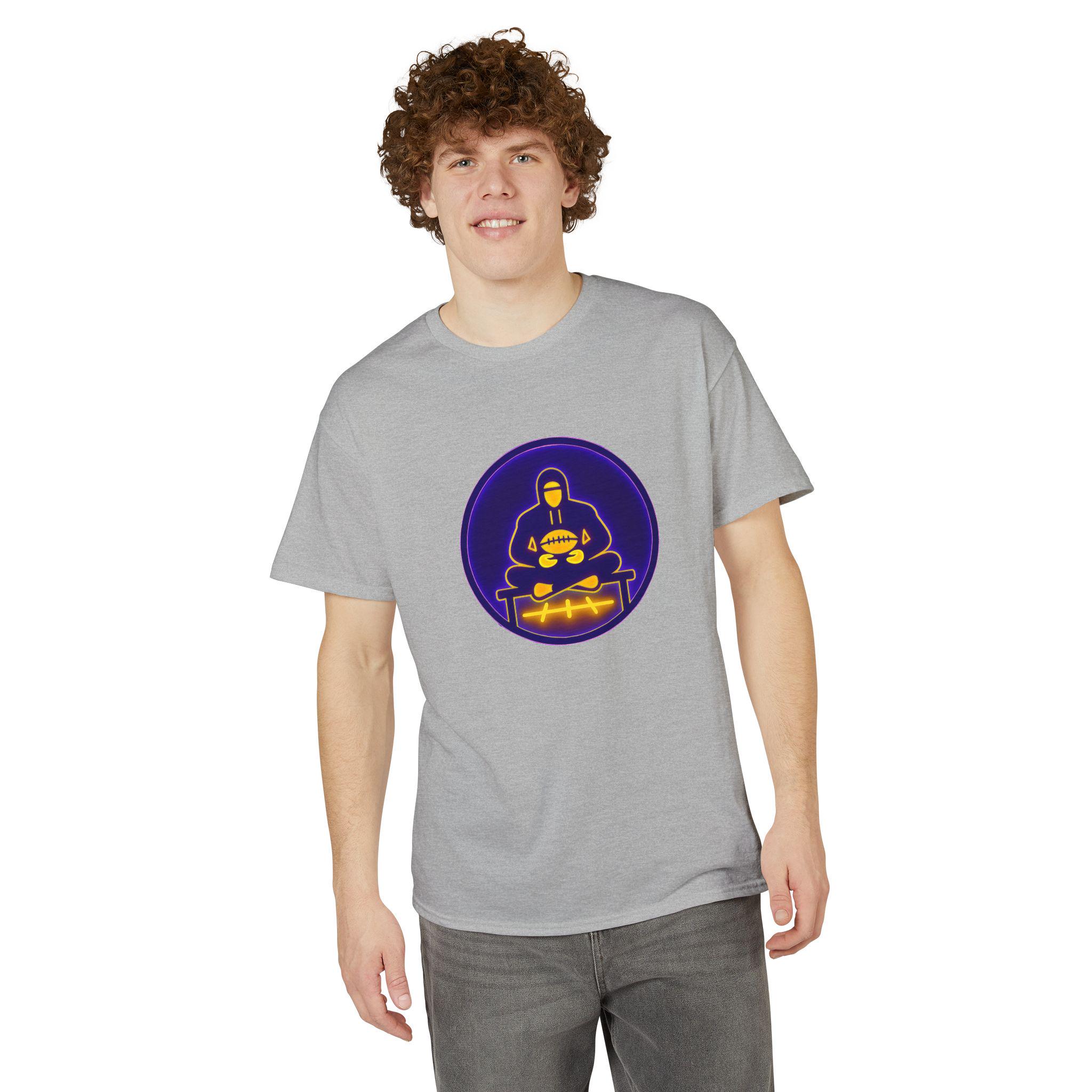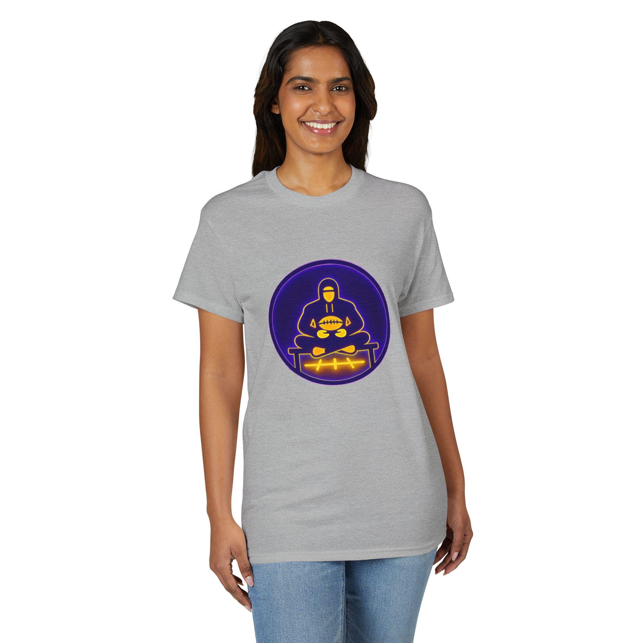 This easygoing tee is built for game-day calm. The front features a minimal “sports meditation” emblem: a centered, eyes-closed quarterback silhouette sitting cross-legged inside a clean circular badge, with a small football horizon line and subtle Norse-geometry accents. The palette is purple, gold, and white, quietly nodding to northern-football culture without team names or logos. On the back, a simple three-line mantra in contrasting type: BREATHE. BELIEVE. BALL.
