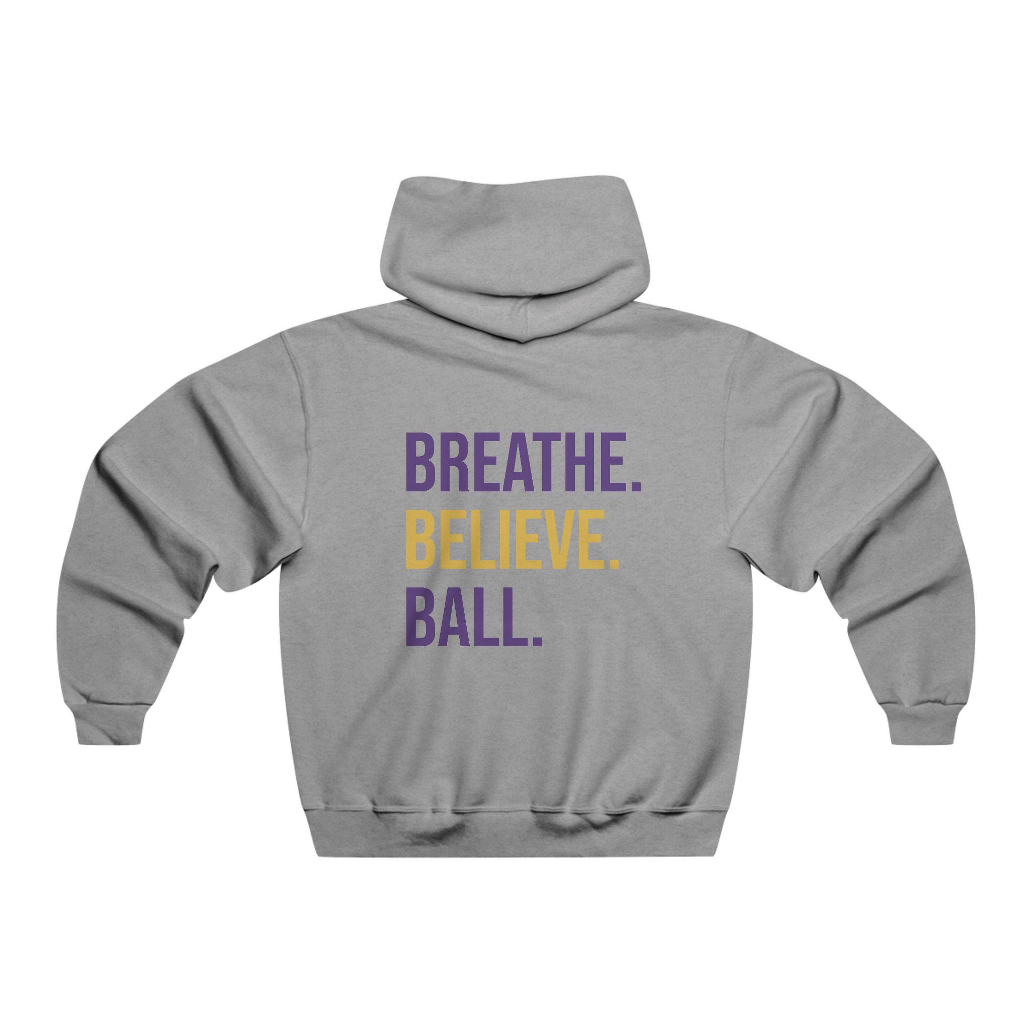 This cozy hoodie is built for game-day calm. The front features a minimal “sports meditation” emblem: a centered, eyes-closed athlete silhouette sitting cross-legged inside a clean circular badge, with a small football horizon line and subtle Norse-geometry accents. The palette is purple, gold, and white, quietly nodding to northern-football culture without team names or logos. On the back, a simple three-line mantra in contrasting type: BREATHE. BELIEVE. BALL.