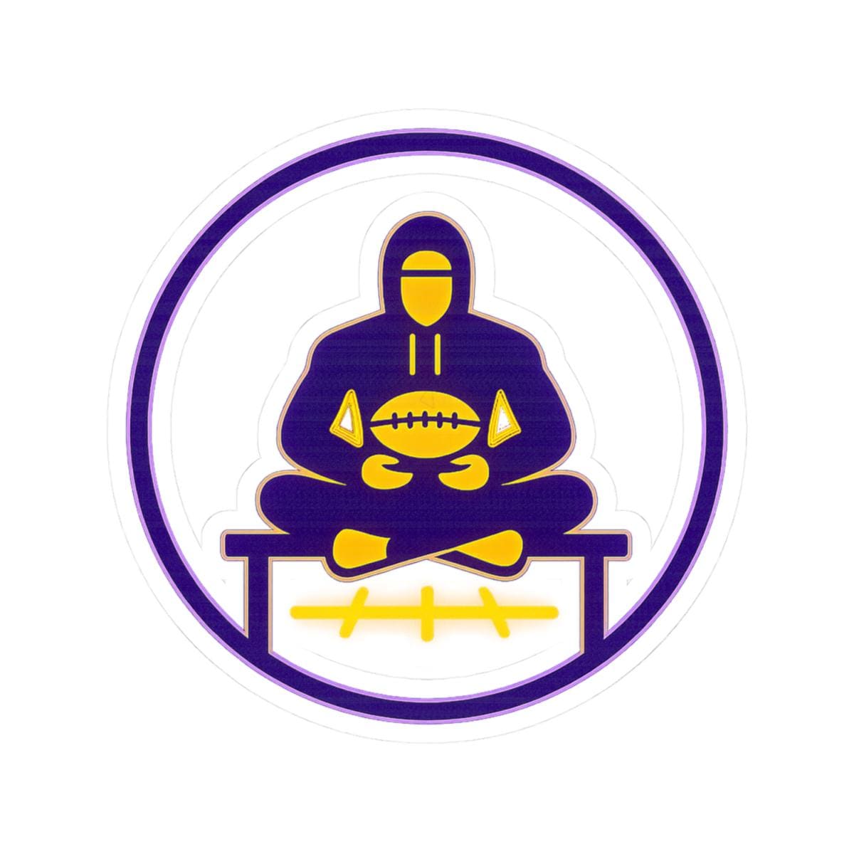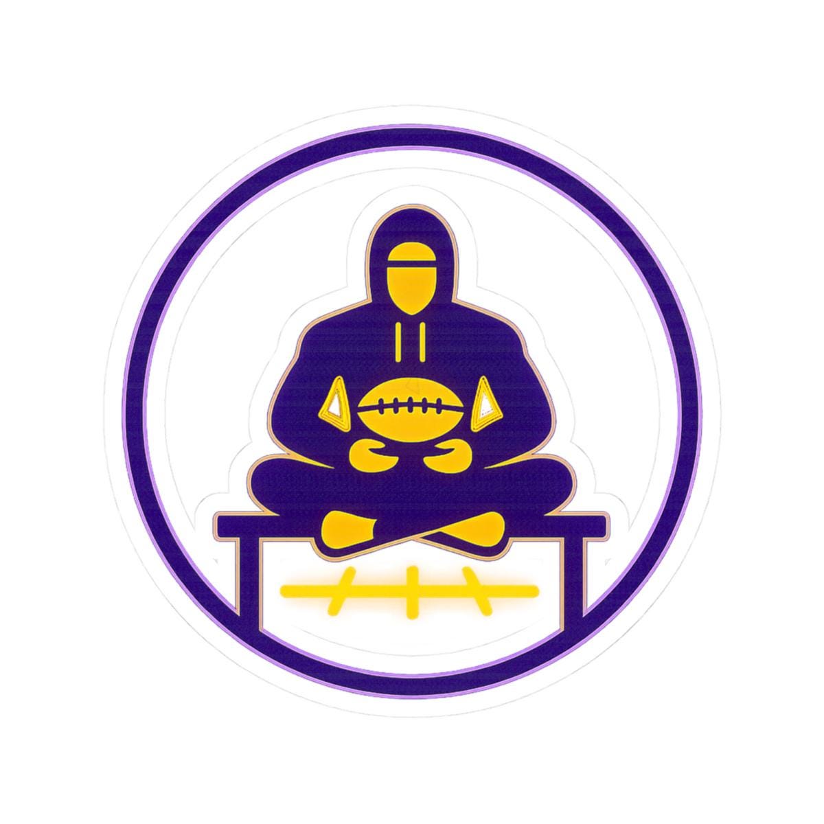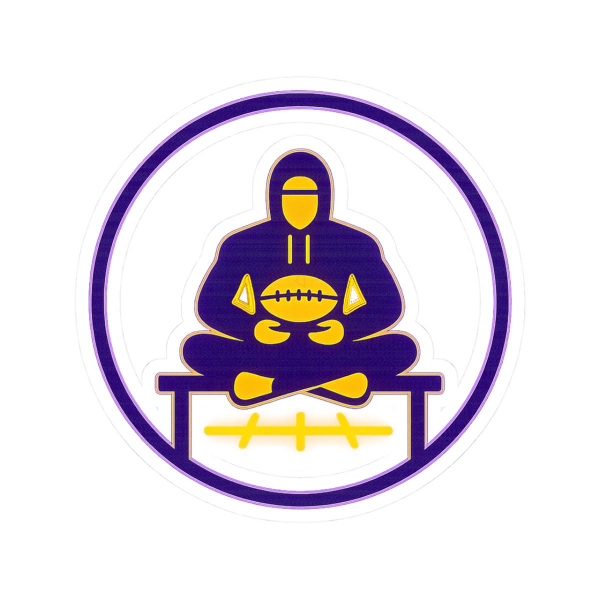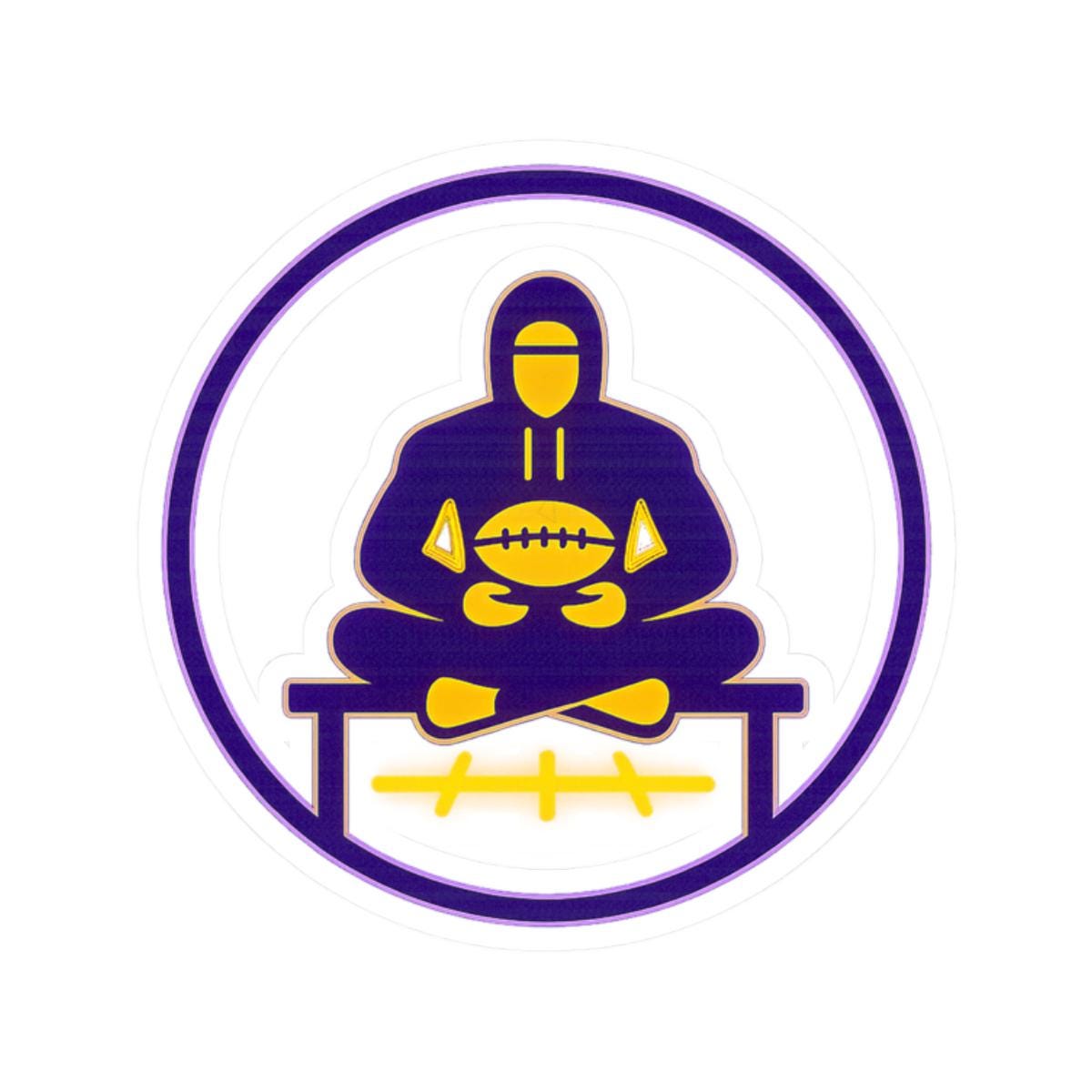 A glossy kiss-cut sticker built for game-day calm. The art shows a centered, eyes-closed quarterback silhouette meditating on a sideline bench inside a clean circular badge, with a small football-horizon line and subtle Norse-geometry accents. Palette: purple, gold, white—quietly nodding to northern-football culture without team names or logos.