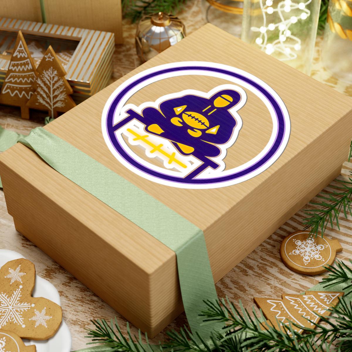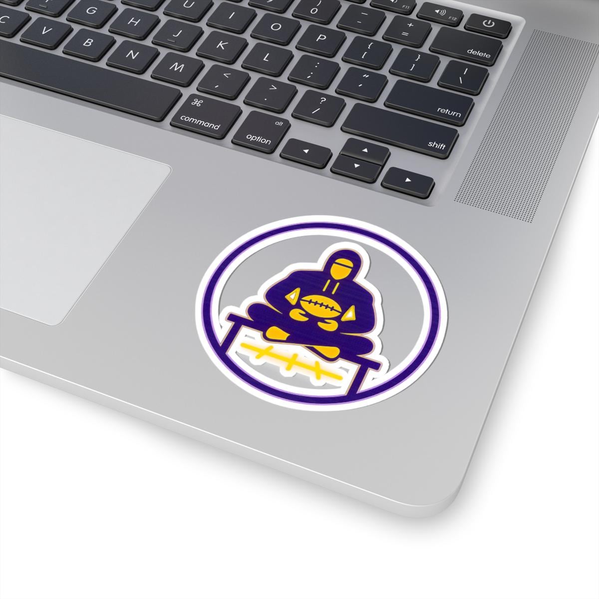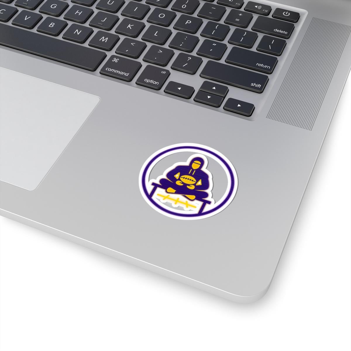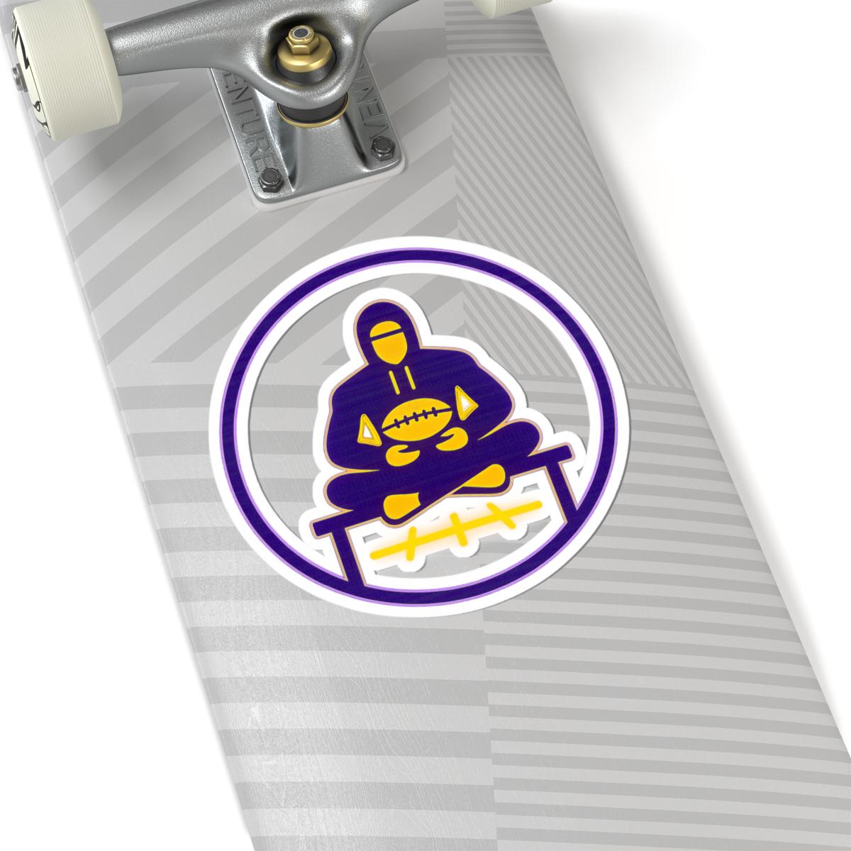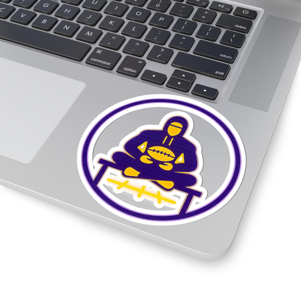 A glossy kiss-cut sticker built for game-day calm. The art shows a centered, eyes-closed quarterback silhouette meditating on a sideline bench inside a clean circular badge, with a small football-horizon line and subtle Norse-geometry accents. Palette: purple, gold, white—quietly nodding to northern-football culture without team names or logos.
