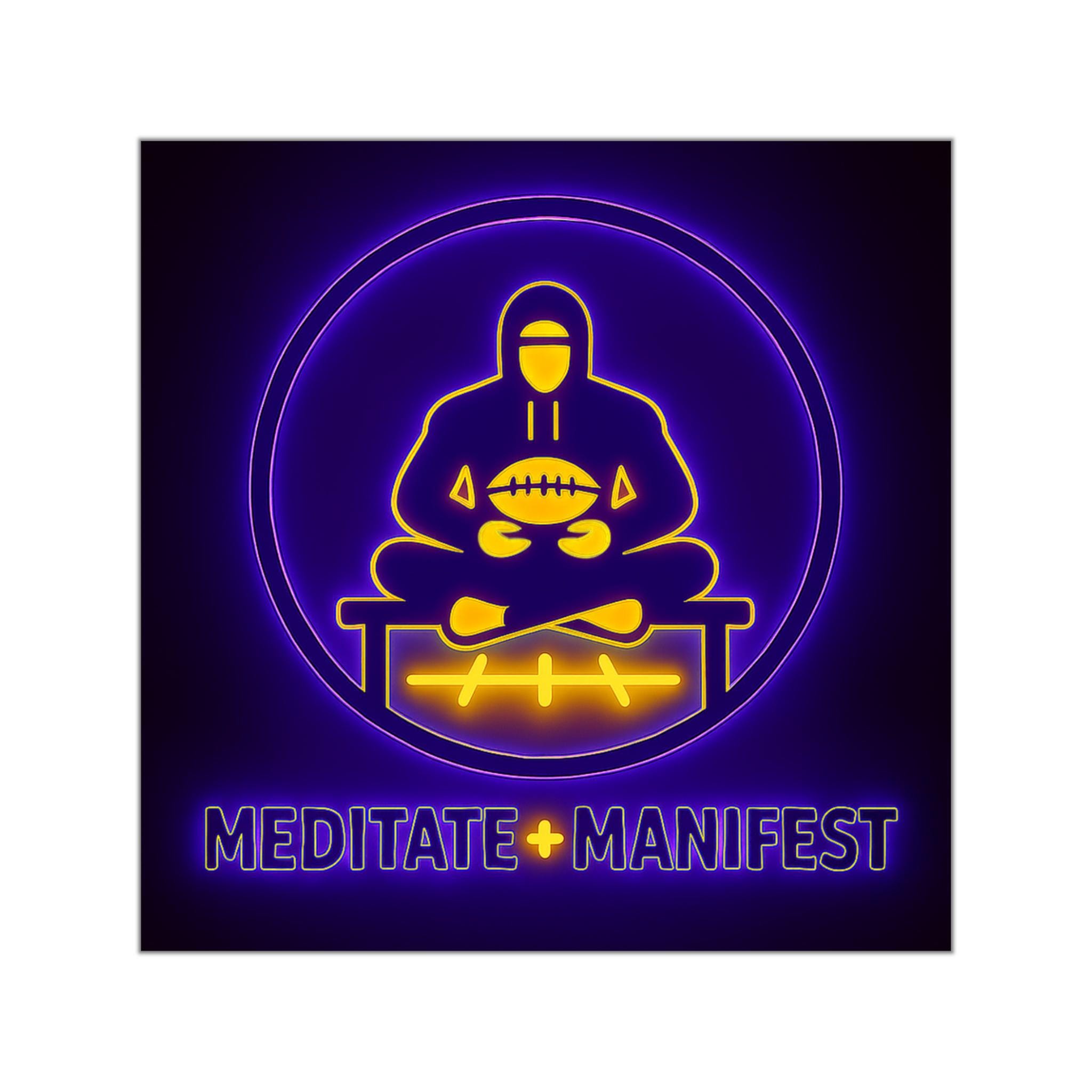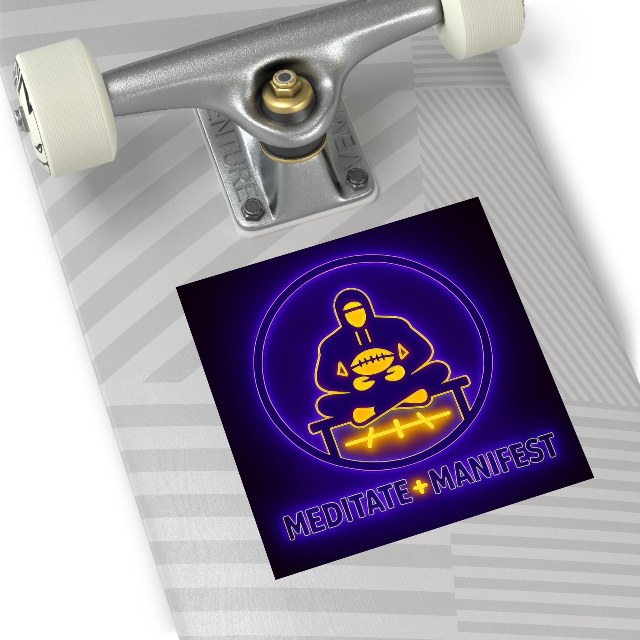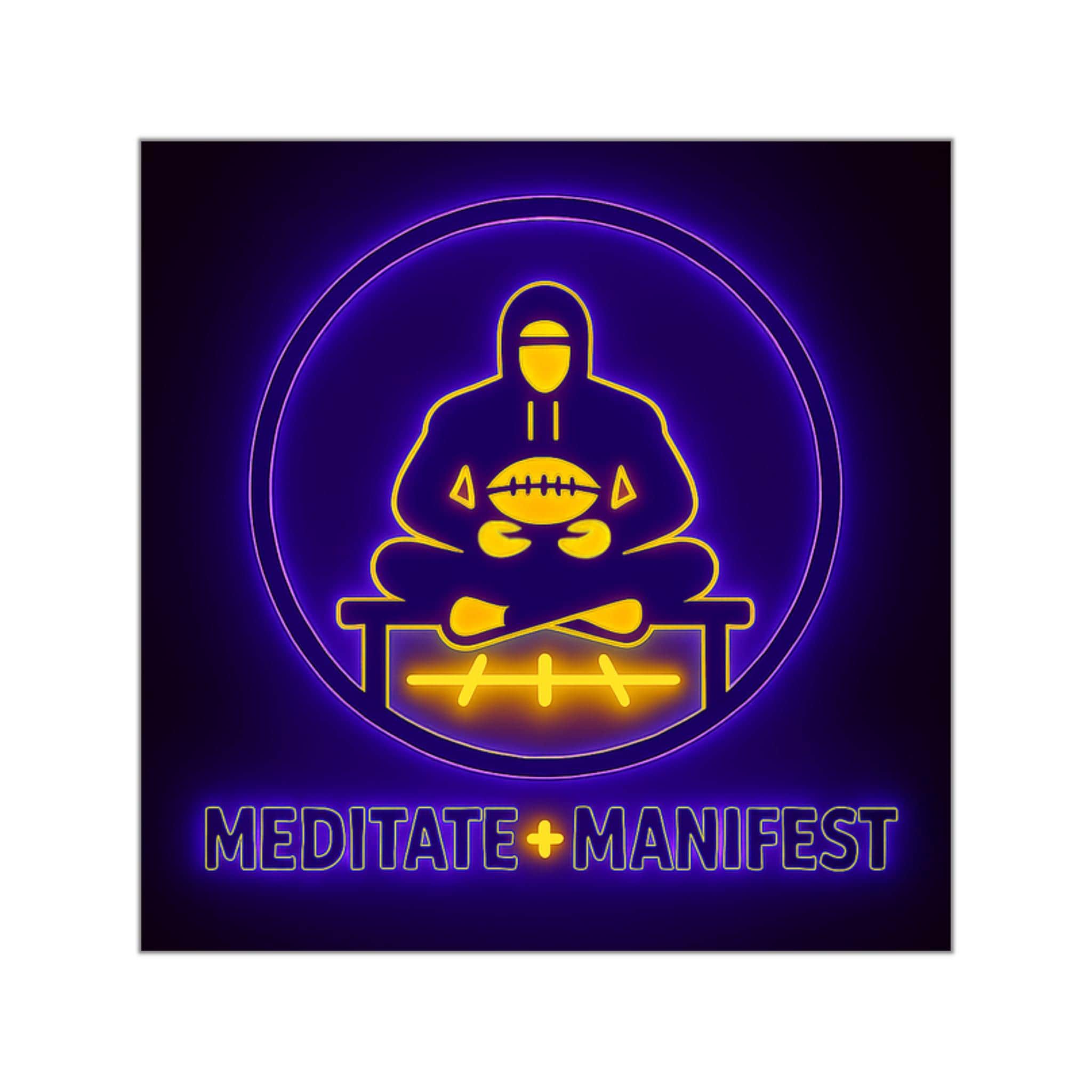 A clean vinyl sticker built for game-day calm. The art shows a centered, eyes-closed quarterback silhouette meditating on a sideline bench inside a round badge, with a small football-horizon and subtle Norse-geometry accents. Palette: purple, gold, white, quietly nodding to northern-football culture without team names or logos:
