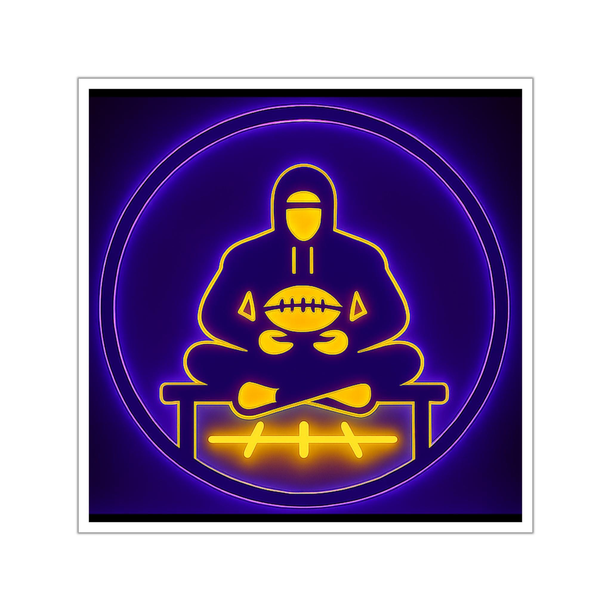 A clean vinyl sticker built for game-day calm. The art shows a centered, eyes-closed athlete silhouette meditating on a sideline bench inside a round badge, with a small football-horizon and subtle Norse-geometry accents.