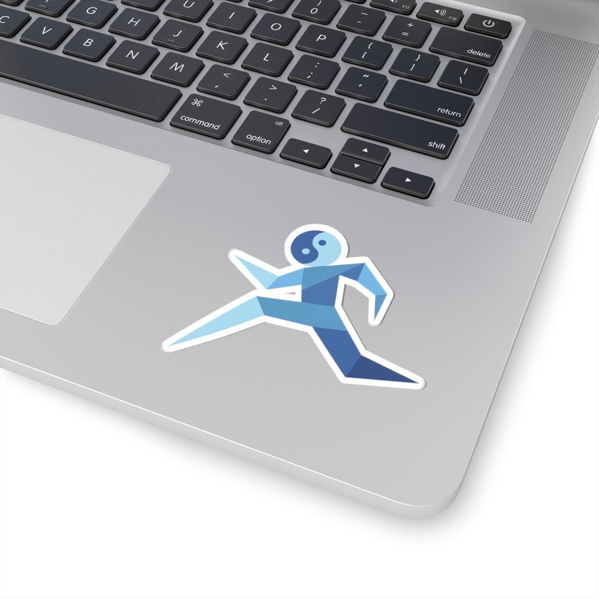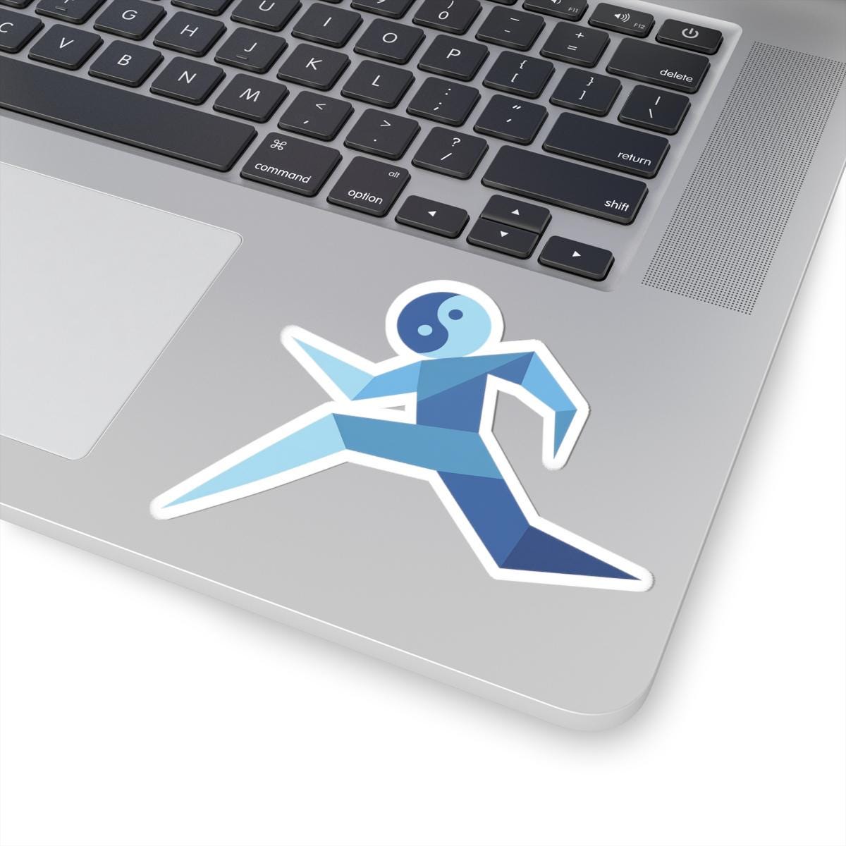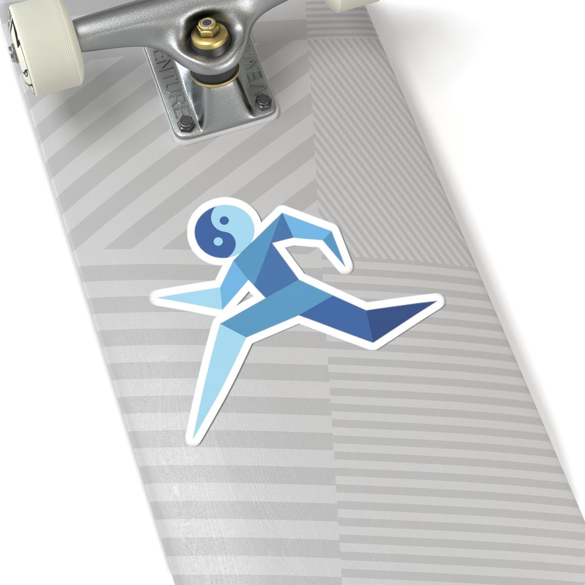 This kiss-cut vinyl sticker features The Mindful Athlete, “The Hero Within” character in motion – a geometric athlete with a yin-yang head, rendered in cool blue tones and clean angles. It’s a little reminder of balance, effort, and staying present whether you’re training, working, or studying.